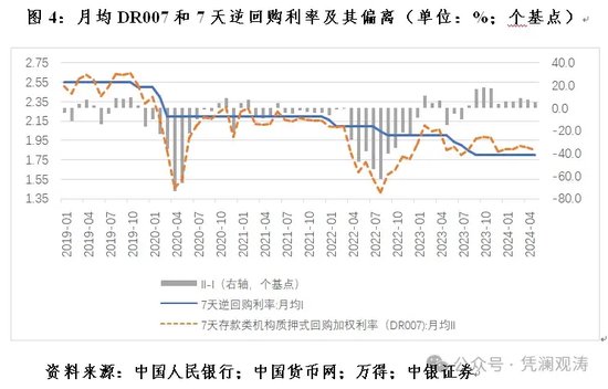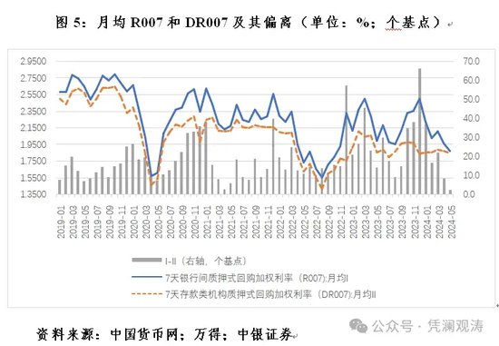 进一步分析,2024年4、5月份,月均7天银行间质押式回购加权利率(R007)与DR007的正差值持续下行,分别为8.6和2.5个基点,低于3月份的22.1个基点,也远低于2023年9月至2024年2月平均34.7个基点的水平(见图5)。这显示市场信用分层不仅没有加剧反而趋于缓解,尤其在政府债券发行提速的情况下。同时,也进一步表明当前市场不缺钱。
