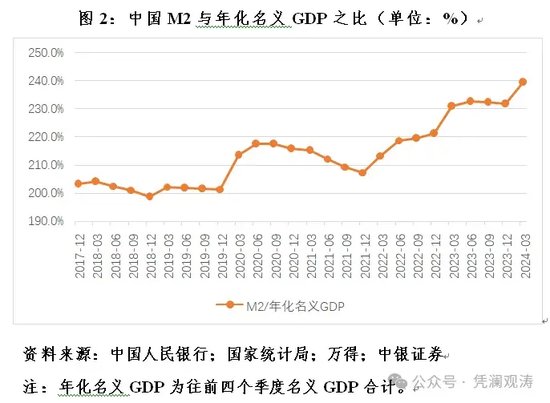 从2023年2月起,我国M2同比增速见顶回落,到2024年4月连续15个月增速环比收窄,由12.9%降至7.0%(见图1)。但考虑到同期名义经济增速持续下行,M2增速放缓并不意味着货币政策对实体经济的支持力度降低。事实上,2024年3月,M2同比增长8.3%,较2023年同期和全年分别下降4.4和1.4个百分点。不过,因为2024年一季度名义国内生产总值(GDP)同比仅增长4.2%,M2与年化名义GDP之比达到239.5%,同比、环比分别上升8.6和7.7个百分点,环比升幅为2020年以来同期第三高(见图2)。
