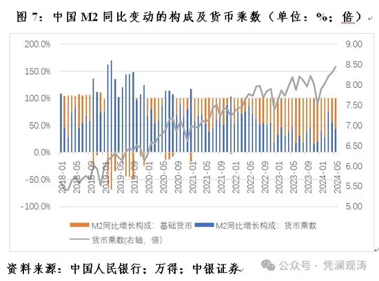需要指出的是,由于M2是同比,所以分析央行资产负债表规模变动,不能看环比而要看同比。尽管2024年前5个月,央行缩表2.74万亿元,基础货币净回笼3.14万亿元,但2023年3月到2024年5月,我国M2同比增长中,货币乘数扩张的平均贡献率为36.2%,基础货币净投放的平均贡献率为63.8%(见图7)。该现象背后是,这个时期央行资产负债表总体是扩张的,基础货币是净投放,货币乘数也是上升的。