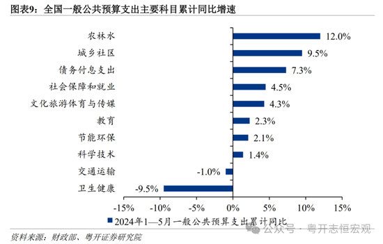 从全国看,受去年增发国债资金带动保持一定强度,结构上有保有压,保民生和稳基建仍是重点领域。分级次看,尽管全国财政收入承压,但受增发国债资金推动,全国财政支出仍保持一定力度。1—5月全国、中央、地方财政一般公共预算支出分别增长3.4%、10.2%、2.4%,中央财政支出力度强于地方支出。分科目看,财政紧平衡下落实有保有压,社保与就业支出同比(4.5%),高于支出总体增速,财政支出积极保就业保民生;基建方面,受到去年增发的1万亿国债资金到位影响,农林水(12.0%)、城乡社区支出(9.5%)同比增速较快,有力支持了相应的基建投资支出。此外,债务付息支出增长较快(7.3%),去年增发国债利息全部由中央财政支出,不增加地方负担。