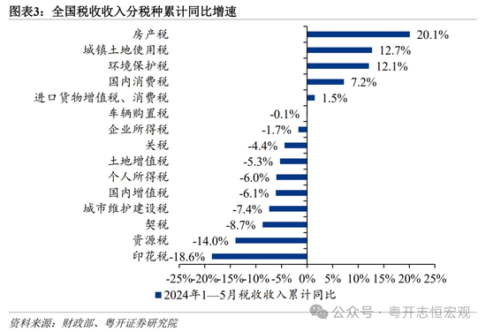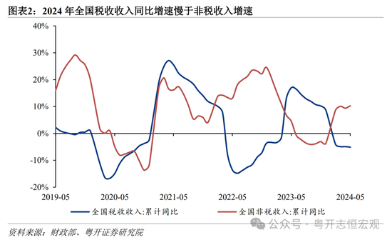 从全国看,一般公共预算收入承压,税收收入与非税收入再现“此消彼长”。2024年,受到去年中小微企业缓税入库抬高基数、结构性减税降费、工业品价格连续负增长等因素影响,1—5月,全国一般公共预算收入同比仅-2.8%。税收收入与经济名义增速高度相关,今年一季度GDP平减指数同比-1.1%,5月PPI同比-1.4%,总需求仍有待复苏,税收收入同比增速(-5.1%)远低于非税收入增速(10.3%)。分税种看,国内增值税、企业所得税、个人所得税收入均同比下降。1—5月房地产相关五大税收收入合计同比由正转负(-0.6%),虽然房产税收入高增长,但土地增值税和契税收入下滑明显。去年8月开始证券交易印花税实施减半增收,导致印花税收入同比跌幅较大(-18.6%)。