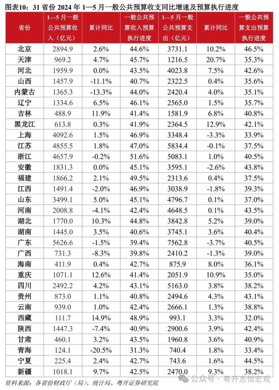 2、地方财政支出增速有待提升,财政紧平衡限制了地方政府促进经济增长和提供公共服务的能力。2024年1—5月,地方一般公共预算支出预算执行进度(38.6%)落后于收入执行进度(44.5%)。广东(-3.7%)、上海(-3.3%)、江苏(-0.1%)、山东(0.1%)、福建(0.4%)、浙江(1.0%)多个东部省份一般公共预算支出增速偏慢。