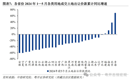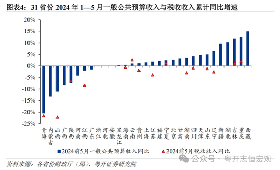 从地方看,总体上,经济恢复基础不牢以及物价低迷拖累财政收入,9个省份前5个月一般公共预算收入同比负增长,部分经济大省收入增长乏力。分区域看,中西部地区一般公共预算收入同比负增长。2024年1—5月,东北、东部、中部、西部地区地方一般公共预算收入同比分别为5.9%、1.2%、-1.6%、-0.6%。分省份来看,31省份中有9个省份1—5月一般公共预算收入同比下降。经济大省收入增长缓慢,2024年1—5月,河南(-4.1%)、广东(-1.5%)、浙江(-0.2%)三个经济大省一般公共预算收入同比负增长,上海(1.5%)、江苏(1.8%)、福建(2.1%)同比增速不高。