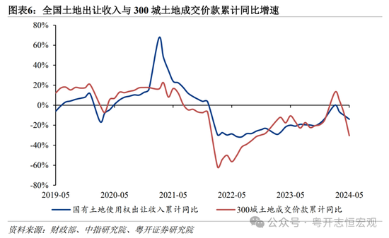 土地市场低迷,土地出让收入进一步下行,对地方财政产生压力。当前房地产市场库存去化困难,特别是住宅用地面临“供需交困”。需求端,2024年新一轮去库存政策对商品房销售的提振作用尚需一段时间生效,住宅用地市场热度相对低迷。供给端,“以房定地”要求下,优先化解存量住宅用地,新增供地放缓的城市增多。2024年1—5月,300城土地成交价款同比下降30.5%;而财政部披露的国有土地使用权出让收入同比下降14.0%。受此拖累,1—5月全国政府性基金预算收入16638亿元,同比下降10.8%,仅完成去年预算的23.5%。由于土地成交价款相对于财政入库的土地出让收入有一定的领先意义,预计2024年全国财政土地出让收入约4.6万亿元,全年降幅在20%左右。