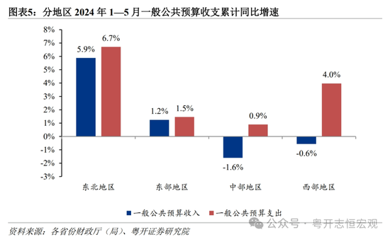 从地方看,地方财政支出有待发力,中东部地区多个省份一般公共预算支出增长相对较慢。从地方财政收支预算执行进度看,2024年1—5月,地方一般公共预算收入和支出分别完成年初预算的38.6%、44.5%,财政支出预算执行进度落后于收入执行进度。分区域看,2024年1—5月,东北、东部、中部、西部地区地方一般公共预算支出同比分别为6.7%、1.5%、0.9%、4.0%。中部省份中,安徽(-2.6%)、江西(-1.8%)1—5月一般公共预算支出同比负增长。东部省份中,广东(-3.7%)、上海(-3.3%)、江苏(-0.1%)、山东(0.1%)、福建(0.4%)、浙江(1.0%)1—5月一般公共预算支出增速较慢。地方财政紧平衡限制了地方政府促进经济增长和提供公共服务的能力,要警惕地方财政收支矛盾加大、基层“三保”压力加大等问题。