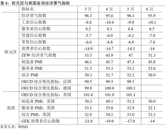 主要经济景气指标喜忧参半。最新的PMI指标显示,欧元区制造业保持低迷,服务业有所改善。6月欧元区制造业PMI为45.8,仍远离50荣枯线,且较5月下滑,服务业PMI为52.8,连续5个月保持50荣枯线上方。其他前瞻指标中, 6月欧元区经济景气指数、工业信心指数、服务业信心指数、营建信心指数和消费者信心指数依旧保持弱势。不过部分领先指标也有所好转,英国、德国5月OECD领先指标回暖至100上方,欧元区ZEW景气指数持续回升,同时英国制造业与服务业PMI指数有所向好。