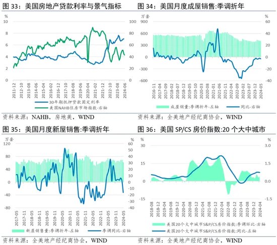 去年4季度以来的房地产市场短期回暖趋势已重回降温。2022年3月美联储启动加息后美国房地产景气指数在房地产贷款利率升高的打压下逐步降温。但随着2023年7月加息结束,市场利率见顶,金融宽松预期加强,美国房地产自去年以来有所回暖,对经济形成支撑。2024年二季度以来,美国降息预期不断延后,房贷利率再次触及高位,美国房地产景气度也重回降温态势。