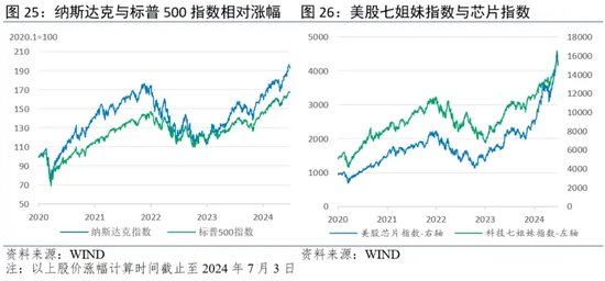 相反,由于AI科技突破短期内推升了美国相关龙头科技公司的股票价格。从走势看,科技成分更高的纳斯达克指数自2020年以来累计上涨了92%,同时期标普500累计上涨了67%。AI科技对于芯片算力的需求猛增,推升美股芯片指数自2020年以来上涨了229%,同时期美股“科技七姐妹”则上涨了97%。股市繁荣带来财富效应,反而支撑了美国的需求。