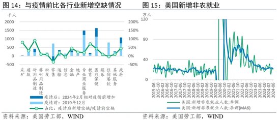 劳动力需求保持平稳。5月美国职位空缺数回升至814万人,仍高于疫情前六、七百万人的水平。从行业看,专业商业服务、教育、医疗等行业职位空缺数量仍较疫情前大幅增多。美国非农就业人数仍在持续增长,使得总体劳动力需求保持平稳。6月美国新增非农就业20.6万人,略超预期的19.0万人,建筑、教育、医疗和政府部门就业新增较多。