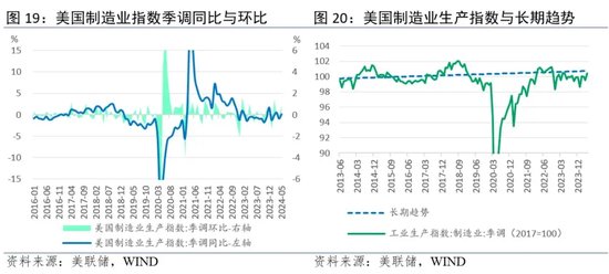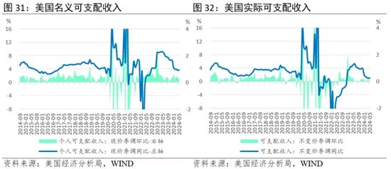 二季度美国零售表现稳健。美国5月零售与食品服务销售同比增长2.3%,较2023年整体水平略有下降,核心商品、机动车、餐饮零售分别同比增长2.3%、1.3%和3.8%。5月个人消费支出表现韧性。PCE现价季调环比增长0.25%,同比增长5.1%,实际季调环比增长0.26%,同比增长2.4%。无论是名义还是实际增速,环比或同比均较前期中枢有所下降,但仍在长期潜在水平之上。
