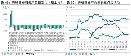 从负债端看,缩表在初期主要减少了联储银行准备金,后期则主要是隔夜逆回购的下降。目前看,在放缓缩表后,近期无论是联储银行准备金还是隔夜逆回购均回归平稳,市场流动性保持在合理水平,有利于高利率条件下维持经济增长稳定,可以为维持高利率争取不少时间。在放缓节奏后,预计美联储可能继续维持缩表6个月以上,大概率在2025年上半年退出缩表,以应对防止市场流动性在经济进一步放缓时出现过度紧缩。