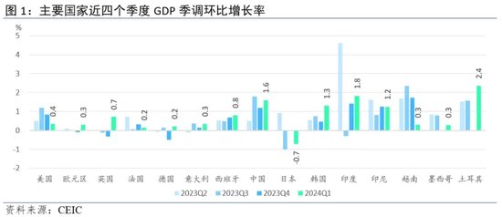 2024年上半年,全球各国经济增长动能转换。美国经济动能从2023年的强劲增长中逐步衰减,一季度GDP季调环比增速回落至1.4%。欧洲经济由衰退边缘边际回暖,法国、德国、英国先后从上个季度的收缩中走出,尽管大病初愈后状态依旧疲弱,但相比一年前的能源危机和贸易条件恶化,目前形势已有所改观。亚洲地区有所分化,中国与韩国稳健恢复,日本经济却意外跌落。新兴经济体中,不少国家受益于投资绕道美国近岸和友岸呈现稳健增长态势,但仍有一些国家深陷困境。
