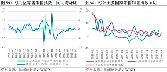 零售销售走出收缩,但复苏动力仍旧偏弱。4月欧元区20国整体零售销售同比持平,好于去年持续收缩的局面,不过季调环比下降0.5%,反映消费复苏仍不稳固。其中,法国零售销售同比增长1.9%,连续4个月回归增长,德国零售销售同比强劲增长4.5%,成为支撑经济恢复的重要动力。英国零售销售有所转弱,4月同比下降1.0%,5月重回增长2.2%,但相比去年平均增速有所下行。