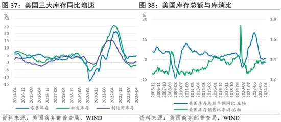 库存周期已进入主动补库存阶段,但未来库存回补将会比较温和。从库存绝对额看,美国批发商与制造商库存分别在2022年11月和2023年1月达到高点,目前同比增速已见底回升。零售商库存绝对值仍在小幅上升,但同比已从底部恢复并保持稳定。4月美国商业库存25452亿美元,较3月小幅增加,同比增长1.0%,增速已较去年11月的最低点回升了1个百分点。