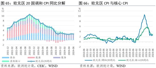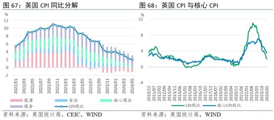 上半年欧洲通胀压力有所减轻。6月欧元区CPI同比上涨2.5%,较上月回落0.1个百分点,较去年12月下降0.4个百分点。核心通胀同比上涨2.9%,与上月持平,较去年12月下降0.8个百分点。英国5月CPI同比上涨2.0%,近年来首次达到通胀目标,较上月回落0.4个百分点,较去年12月下降1.9个百分点。核心通胀同比上涨3.5%,较上月回落0.3个百分点,较去年12月下降1.6个百分点。整体看,欧元区与英国面对的通胀结构略有不同,欧元区能源和服务下行趋缓,主要依靠食品和耐用消费品下降。英国主要依赖食品和能源下降,尽管核心通胀也有所降温,但距离政策目标仍有距离。