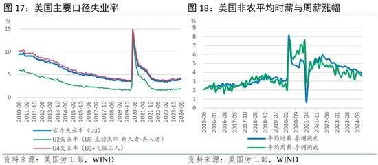 失业率小幅升高。6月美国失业率自2022年初以来首次超过4%至4.1%。在持续的高利率限制下,今年以来美国失业率累计升高0.4个百分点,反映经济降温路径相对平缓。薪资增速缓慢下降,6月美国平均时薪同比增长3.9%,仍接近“2%潜在增速+2%通胀目标”的关键水平,对缓解“工资—通胀螺旋”的效果尚不明显。