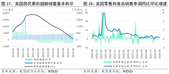 超额储蓄对美国消费的支撑作用比预期更为持久。疫情期间居民部门最多时期积累了超过2.2万亿美元的超额储蓄,经过长达2年半的消耗,目前已接近耗尽。此前流行的观点认为,由于存在收入分配不公平问题,不需要等到超额储蓄耗尽美国消费就会减弱。但从实际情况来看,超额储蓄对美国消费的支撑持续度好于预期。