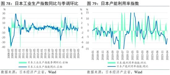 工业生产从地震影响中逐步恢复。2024年以来日本工业生产表现不佳,主因1月能登半岛地震,影响汽车、半导体相关产业链。1月日本工业生产指数环比大幅下跌6.7%,创疫情以来最大跌幅。不过随后产业链逐步复苏,至5月,日本工业生产指数环比增长2.8%,同比则回升至0.3%,为去年11月以来首次回升至正增长。5月日本制造业PMI回升至50.4,为11个月来首次高于荣枯线,6月小幅回落至50,表明制造业保持缓慢复苏态势。不过目前偏低的产能利用率依然暴露出日本制造业订单不足以及过于依赖外需的问题。