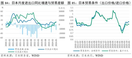 上半年贸易逆差收窄。2022年年初至2023年年中,日本贸易条件受国际能源价格上涨及日元贬值影响一度恶化,月度贸易逆差屡创新高。直到2023年下半年日本一度接近贸易平衡,主因国际能源价格回调和日元汇率好转。然而2024年上半年日元汇率继续走弱,国际能源价格则横向波动,日本贸易条件改善的动能衰减,也导致日本贸易逆差重现。1-5月份日本累计贸易逆差3.46万亿日元,5个月中有4个月均呈现逆差,不过由于去年同期逆差规模更大,前5个月贸易逆差同比明显收窄。