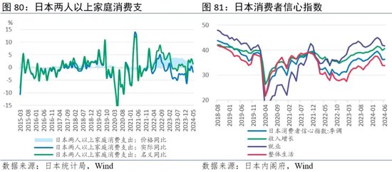 家庭消费依旧表现疲软。5月日本两人以上家庭消费支出名义同比增长1.4%,由于落后于物价涨幅,实际同比下降1.8%,创近4个月来最大降幅。名义家庭消费增长主要依赖于价格平减指数同比上涨3.3%。从原因看,汇率贬值与通胀上升对消费信心造成了冲击。日本内阁府公布的数据显示,6月日本消费者信心指数仅为36.4,仍保持低位徘徊,就业与收入增长指数分别为41.7和40.6,均弱于今年一季度水平,整体生活指数也仅有33.8。尽管今年“春斗”工资涨薪幅度创下历史新高,但由于通胀中枢同步上升,工资增长并没有出现明显的消费刺激作用。