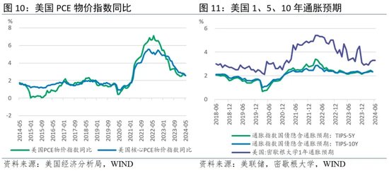 通胀预期抬头,预示下半年美国通胀仍较为顽固。6月FOMC会议纪要显示,美联储预计2024年核心PCE为2.8%,较3月预计升高0.2个百分点,2025、2026年则分别为2.3%和2.0%。密歇根大学调查显示,6月消费者对于未来1年期的通胀预期为3.3%,高于去年12月的3.1%,通胀指数国债隐含的5年和10年预期均为2.3%,也略超2%的通胀目标。由于通胀预期是未来通胀的关键变量,从预期看美国通胀达标依旧路途遥远。