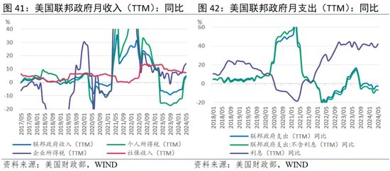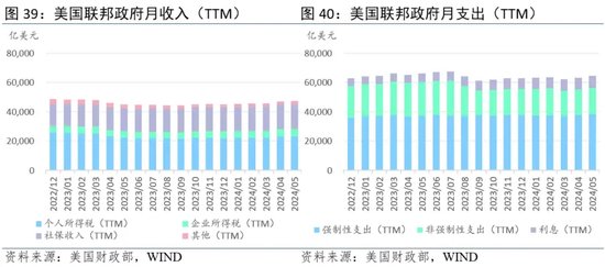 预计今年美国财政收入有所恢复。今年以来财政收入明显改善,其中个人所得税受益于通胀回落起征点涨幅下调,TTM同比已由去年的两位数下降回升至增长,企业所得税则获益于去年因灾纳税申报延期影响回归两位数高增长。目前美国国会预算办公室(CBO)预计2024财年美国财政收入将由上年的4.81万亿美元增加到4.89万亿美元。