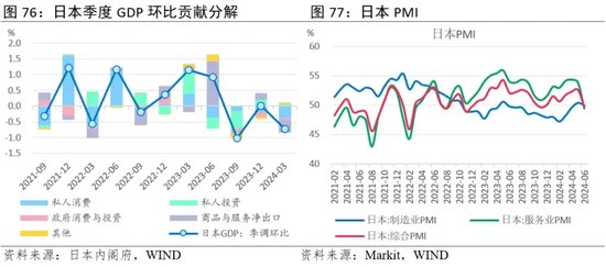 2022年以来,日本经济疫后复苏一直不如人意,经济规模距离疫情前长期趋势差距越来越大,至2024年一季度已落后长期(线性外推)趋势4.8个百分点,是主要经济体中复苏力度最弱的。2023年上半年日本经济一度强劲反弹,但下半年急速冷却,最近三个季度日本GDP季调环比年率分别为-4.0%、0.1%和-2.9%,仅勉强避免了技术性衰退。
