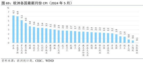 分国别看,欧洲大部分国家通胀压力均有所下行。5月份,仅冰岛、白俄罗斯、罗马尼亚CPI涨幅依旧高于5%,其他国家CPI均下降至5%以下。意大利、立陶宛、亚美尼亚、拉脱维亚四国的CPI涨幅已下降至1%以下。核心国家中,法国、德国、西班牙5月CPI涨幅分别为2.3%、2.4%和3.6%。欧洲各国通胀分化较前期明显缓和,通胀中枢整体下行,为欧央行进一步推行降息打开了空间。