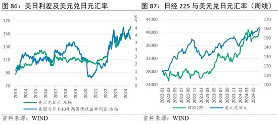 日元贬值压力持续增大。上半年日元汇率一改2023年四季度持续升值的良好趋势,由年初美元兑日元140附近点位,连续突破150、160大关,至7月初已单边贬值至161上方,列主要国家货币贬值幅度之首。从贬值原因来看,一是年初能登半岛地震对日本经济造成巨大冲击,一度改变了日元升至预期。二是美元指数表现强劲,一季度美国经济好于预期,并未出现市场预期中的衰退。三是美日利差扩大,由去年末的3.21%扩大至4月中旬的3.76%,最大增幅超过50bp。四是日本经济的长期结构性因素,4月中旬以来美国经济减速特征逐步显现,日美利差也开始收窄,但日元汇率却反常快速贬值。日本央行在3月加息亦无法扭转日元疲弱局面,背后原因只能从长期结构性因素中考虑。