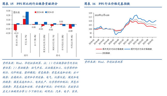 PPI环比降0.2%,从具体行业链条的环比来看,1)国际定价大宗品价格传导分化,原油链条跌,有色链条涨。2)“迎峰度夏”来临,需求季节性增加,煤炭价格续涨。3)广义财政发力较慢、地产销售依然低迷,预期转差叠加需求淡季来临,钢材价格下跌。但减产叠加新国标实施推动水泥制造价格明显上涨。4)供给较强的新兴制造业行业,价格下行压力依然较大。