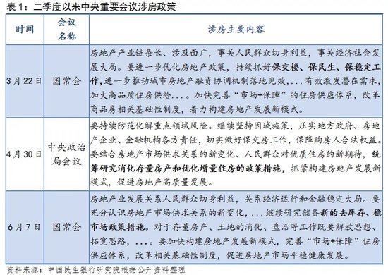 6月7日,国务院常务会议召开,听取关于当前房地产市场形势和下一步构建房地产发展新模式有关工作考虑的汇报,再次强调“房地产业发展关系人民群众切身利益,关系经济运行和金融稳定大局”,直面当前房地产形势,把房地产问题提升到了“金融稳定大局”的高度,明确提出“去库存”目标。预计下半年,将围绕这一总目标,各部门将继续联合发力进行施策,保民生、保稳定。