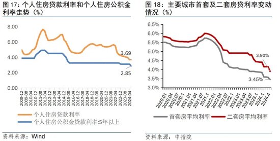 二是优化限贷政策,降低购房成本。5·17四部门联合会议宣布降低全国层面个人住房贷款最低首付比例、取消全国层面个人住房贷款利率政策下限。这两项政策直接规定了全国范围内,首套房和二套房贷利率均不再设置政策下限,实现房贷利率市场化,给予地方政府更大的自由裁量权。当前,所有城市贷款利率均降至“4字头”以下,一线城市首套、二套平均贷款利率分别为3.48%、3.82%,二三线主要城市平均贷款利率在3.36%、3.7%。公积金方面,也在全国范围内调降了0.25个百分点,到了“2字头”,五年期以上首套利率为2.85%,二套为3.325%。5·17新政逐步落地,在购房成本上做“减法”,减轻居民端负担,提振了市场人气,为楼市回暖创造了条件。预计将有更多城市下调房贷利率,核心城市房贷利率议价空间有望打开。