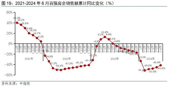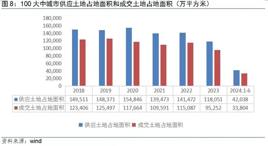 2023年土地供应和成交面积出现了一个较为明显的下降,2024年土地供给继续缩减。1-6月,100大中城市供应土地占地面积和成交面积分别为42037万平方米和33803万平方米,同比下降15.7%和20.6%。按时序进度看,1-6月份,供应土地和成交土地占地面积分别为2023年的35.6%和35.5%。预计土地缩量还将持续,供给偏弱也将对销售构成影响。