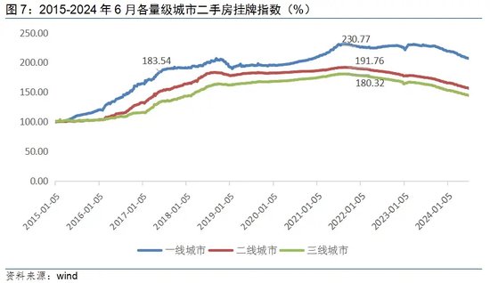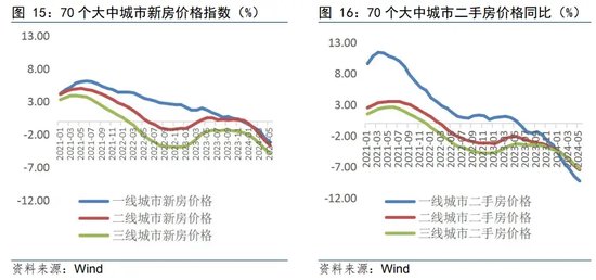 从各量级城市看,一线城市新房价格较二三线城市韧性更强。2024年5月,新房价格当月同比分别为-3.2%、-3.7%和-4.9%。二手房方面,各量级城市价格当月同比分别为-9.3%、-7.5%和-7.3%,一线城市“以量换价”明显,一定程度也决定了二手房整体的走势。