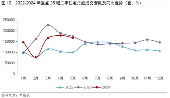 2024年前五个月,25个代表城市二手住宅成交套数同比下降12.9%。新房和二手房累计总成交套数同比下降26.5%,其中二手房成交占比提升64.5%。二手房“以价换量”表现持续好于新房,政策刺激效果明显,6月成交量同比转增,但传导至新房仍需要时间。