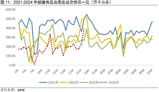 从周度数据看,随着2024年各项政策连续出台,销售端改善较为明显。新建商品房交易从第25周(6.17-6.23)开始超过2023年同期,出现向好迹象。
