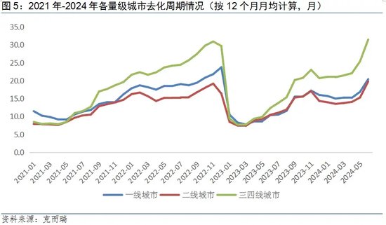 去化周期方面,2024年上半年,全国37个典型城市去化周期为18.4个月,高于2023年年均12.5个月水平,低于2020年均20.3个月水平。按近12个月月均销售面积计算,2024年6月,一线城市出清周期20.4个月,较2023年末延长4.4个月,二线城市20个典型城市去化周期19.8个月,较2023年末延长5.5个月,12个三四线城市典型城市去化周期23.9个月,较2023年末延长5.5个月6.9个月。各线城市均低于18个月的合理范围,且三四线城市去化周期较一二线城市仍在拉长,去化周期继续承压。