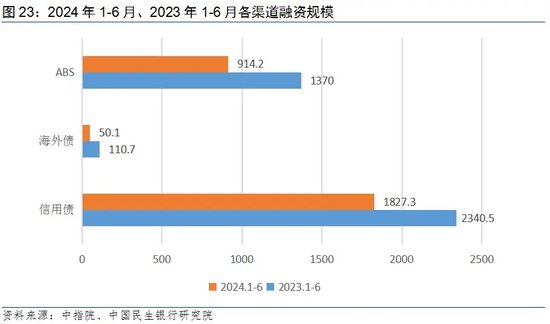 直接融资方面,根据中指数据,2024年上半年,房地产行业共实现债券融资2791.6亿元,同比下降26.9%,降幅较上年有所扩大。其中,信用债同比-21.9%,海外债-54.8%,ABS-33.3%,各渠道同比均出现下降,海外债锐减,信用债仍为融资主力。从融资成本来看,1-6 月,房地产行业平均融资利率为 3.1%,同比下降 0.7 个百分点,其原因是受近期高成本的海外债融资规模下降等多重因素影响,行业平均融资成本明显下降。