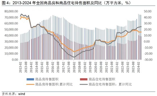 2024年6月,全国商品房待售面积7.39亿平方米,商品住宅待售面积3.87亿平方米,同比增长15.2%和23.5%,比上月同比缩小0.4个百分点和0.9个百分点。虽然仍处在高位且同比有增,但出现绝对值连续四个月下降的向好迹象。上一轮待售面积处于历史高位是2016年2月,全国商品房待售面积、商品住宅待售面积分别为7.39亿平方米和4.66亿平方米。与本轮相似,达到峰值前,出现了连续三年待售面积持续增长现象。现阶段,在2021年、2022年及2023年三年待售面积持续增长的情况下,待售面积再次登高。2024年6月7日,国常会明确坚定地提出“去库存”,预计后续政策将持续宽松和持续,加快去库存进度。