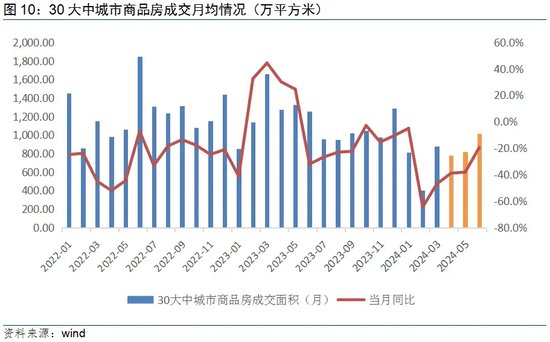 季度及月度数据看,随着中央和地方政策拳组合发力,市场信心有所修复,传导至销售端较为明显。从30个大中城市商品房成交情况看,二季度较一季度增长24.8%,且呈阶梯状逐月回升。受高基数影响,2024年30大中城市商品房成交当月同比仍在负值区间,但从2月份开始,降幅明显收窄。