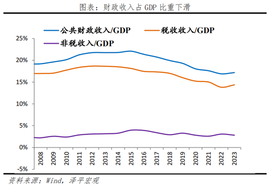 近年来财政收入同GDP比值下降,制约财政逆周期操作空间。根据财政部数据,2018-2023年财政收入年均同比增长3.4%,增幅低于同期内复合GDP 4.9%的增长,而2013-2018年间二者年均增速分别为7.3%和7%。2023年公共财政收入和税收收入占GDP的比重分别为17.2%、14.3%,十年内较峰值分别下滑了4.9%和4.2%。宏观税负下降,一定程度上对财政扩张空间形成掣肘。