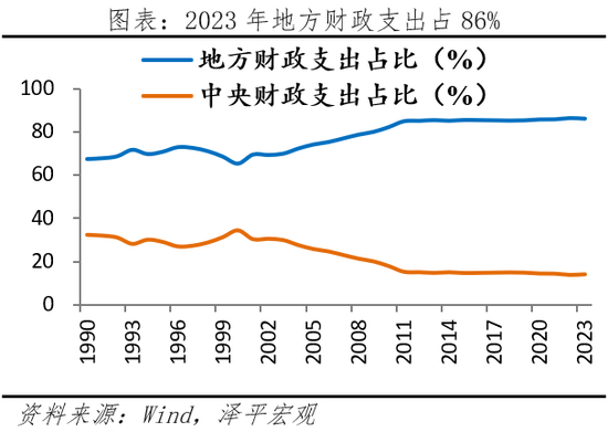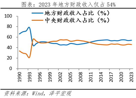 4)央地财权事权不匹配,消费税尚未与地方共享。2023年地方收入占比占54%,但支出责任占比86%。地方税种范围较窄,叠加刚性支出较多,部分地区财政形势疲软,财力承压。