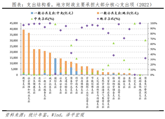 地方主要承担公共支出压力,支出责任占比86%。改革发展、社会稳定及社保和还息等刚性支出较大,主要都是由地方财政负担。教育、社保就业、卫生健康、一般公共服务等前十大核心财政支出项中,八项都是地方财作为负担的绝对主导。23个常见财政支出项占比中,仅有5项是中央财政领先。地方税种范围较窄,叠加减税降费力度加大,部分地区财政形势疲软,财力承压。个别地区甚至出现负担基本公共服务难的现象,反映出当前部分地区收入支出权责的不匹配。