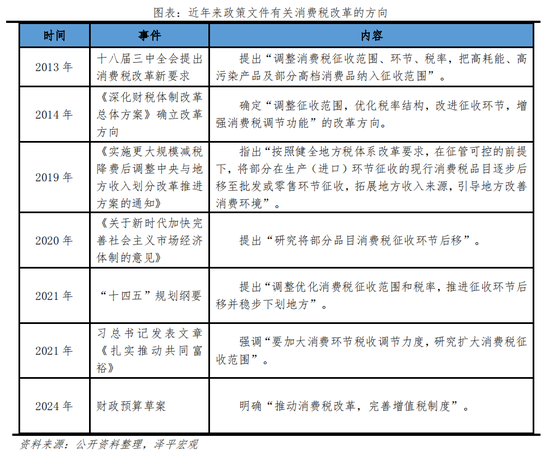 第三阶段是2022年之后,监管层反复强调“消费税征收环节后移”“稳步下划地方”等消费税改革方向,具体改革仍未落地。“新一轮财税体制改革”是三中全会“全面深化改革”的重要领域。今年年初财政预算草案中明确“推动消费税改革,完善增值税制度”后,市场热议税改第三阶段可能在三中全会落地。