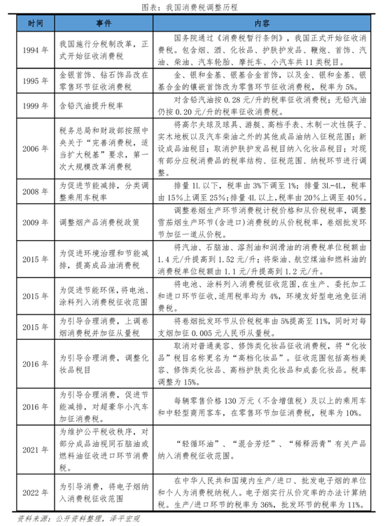 消费税自1994年正式开始征收至今,经历十余次细则调整,结合国家政策导向文件的内容可大致分为三个阶段: