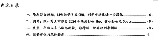 核心观点:1、降息符合预期,LPR挂钩7天OMO,利率市场化进一步深化。2、本次LPR调降10bp对银行2024年息差影响1bp左右,对营收和税前利润分别影响0.5pcts/1.1pcts。3、从近期LPR以及存款利率的调整来看:央行每下调LPR两次,接着大行就会下调挂牌存款利率两次,而今年初以来已降息两轮,新一轮存款利率调降可期。