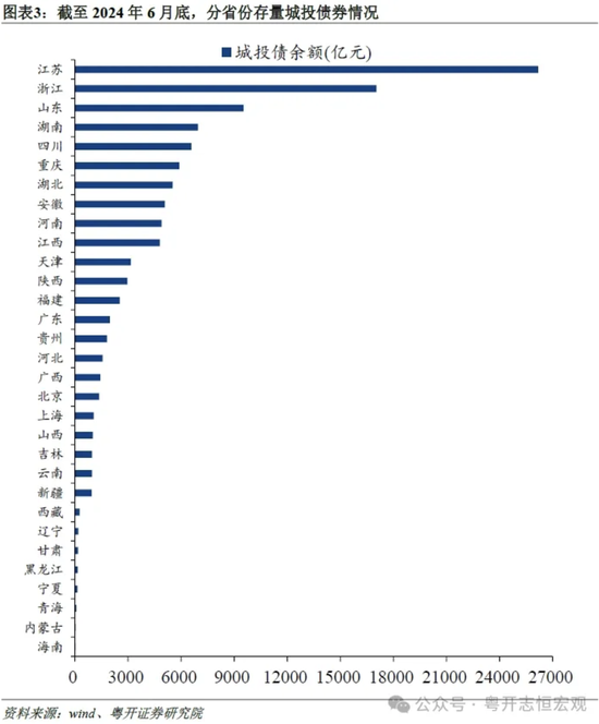 存量城投债券规模减少,主要集中于江浙鲁湘川五省。截至2024年6月底,城投债券余额为11.5万亿元,较2023年底减少1.5%;城投债券占我国债券市场余额的7.0%,较2023年底下降0.5个百分点。分省份来看,存量城投债券主要集中于江苏、浙江、山东、湖南、四川五省,规模分别为26181.4、17042.8、9530.4、6951.6和6575.1亿元,占全国的比重分别为22.7%、14.8%、8.3%、6.0%和5.7%,合计占比达到57.5%。相对而言,12个重点省份的城投债券余额较少,合计存量规模仅为14951.7亿元,占全国的比重为13.0%。