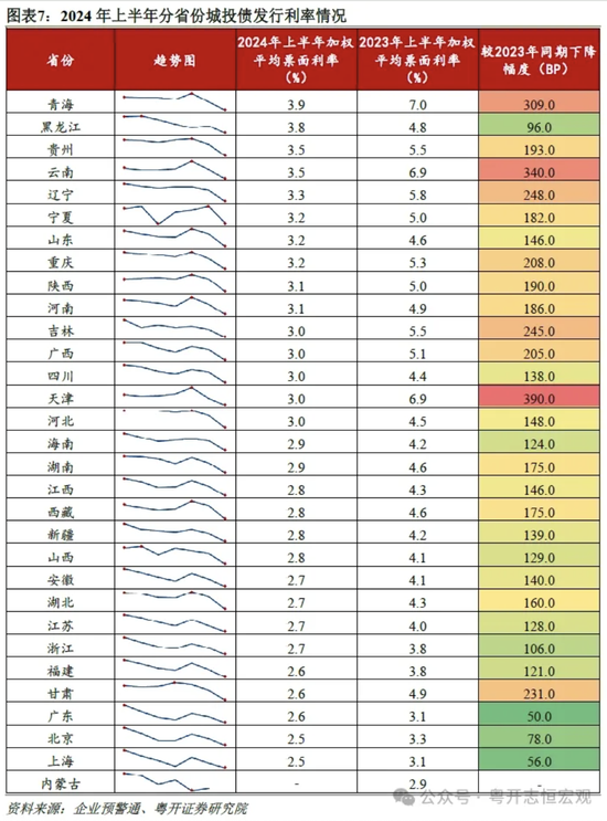 分省份来看,上半年青海、黑龙江、贵州和云南四省份城投债加权平均发行利率较高,分别为3.9%、3.8%、3.5%和3.5%;上海、北京和广东加权平均发行利率较低,分别为2.5%、2.5%和2.6%。从变化趋势来看,天津、云南和青海下降幅度最大,分别下降390BP、340BP和309BP至3.0%、3.5%和3.9%。2024年6月份,不考虑未发行城投债的省份,城投债加权平均发行利率高于3%的省份仅有青海和云南,分别为3.7%和3.4%。