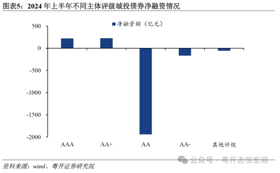 分主体评级来看,AAA和AA+级城投债净融资额仍为正,分别为220.3和226.5亿元,AA、AA-和A+及以下评级城投债均表现为净偿还,净偿还规模分别为1940.2、166.4和56.4亿元,合计净偿还规模达2163.0亿元,导致存量城投债向高评级主体集中。