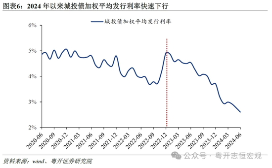 三是城投债发行利率延续下行,重点省份下降幅度较大。2023年7月底中共中央政治局会议提出“制定实施一揽子化债方案”以来,各地积极推动落实相关化债方案,提前兑付高息城投债。同时,在严控地方政府隐性债务背景下,城投债发行审核趋严、供给不足,资产荒背景下投资者抢购城投债,进一步压低城投债发行利率。2024年6月,城投债加权平均发行利率下行至2.6%,较2023年12月下降110.9BP。